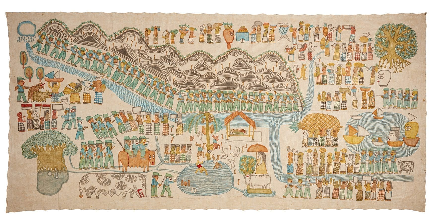 Image: Jumaadi, Siapa yang menjelma sungai & siapakah perampoknya [And who is the river and who are the theives], 2019, Acrylic on cotton cloth primed with rice paste, 152 x 330 cm, Photo: Tim Connolly