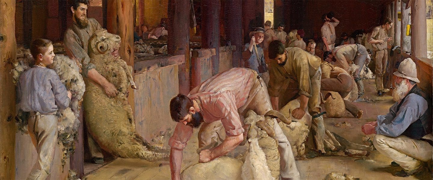 Featured Image – Tom Roberts, Shearing the Rams, 1890 (Detail). Oil on canvas on composition board, 122.4 x 183.3cm.